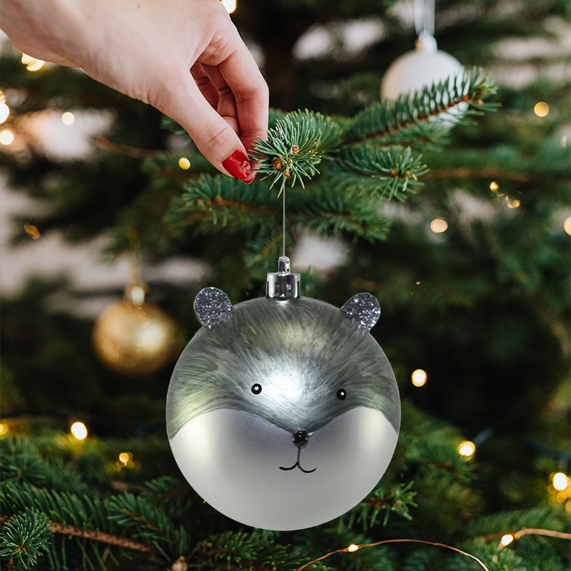 This plastic Christmas ball has an overall rounded spherical shape with a smooth and delicate surface. The silver-grey tone is dominated by the white face area, outlining the cute bear's facial image, with vivid and adorable black eye and nose detailing, which makes people love it at a glance. The top of the sphere is thoughtfully fitted with a hanging loop for easy hanging. The bear's ears are decorated with sparkling diamonds, which are glittering under the light with excellent shining effect, adding a strong festive atmosphere to the whole Christmas ball, making it stand out among many decorations and attracting people's attention.